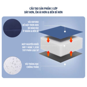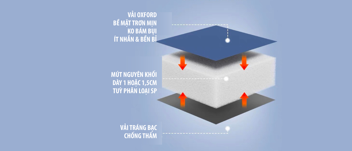 - Mặt trên là vải oxford – là sợi vải kết hợp giữa bông và polyeste, có nhiều ưu việt như: bề mặt vải trơn mịn, không bám bụi, ít nhăn, độ bền cao và chống nước tốt, nhanh khô.