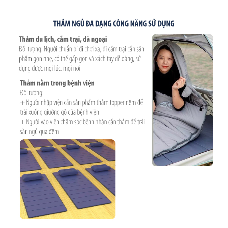 - Người chăm bệnh nhân cần thảm ngủ nhỏ gọn, có túi đựng tiện lợi để mang vào và di chuyển nhiều chỗ khi nằm ngủ trong bệnh viện.